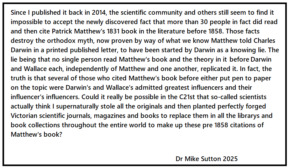 We now newly know that Matthew’s (1831) book, On Naval Timber and Arboriculture, was read and then cited in published print by at least 30 people pre 1858. Several of them were acknowledged influencers of Darwin and Wallace and their influencers. These are independently verifiable empirical data facts of what is in the historical publication record. Just like fossils in the geological record. The problem is that our institutions of science are studiously failing to engage with these facts and are instead holding on to the beloved science myth of the story told by Darwin even though it is proven to be a complete myth.